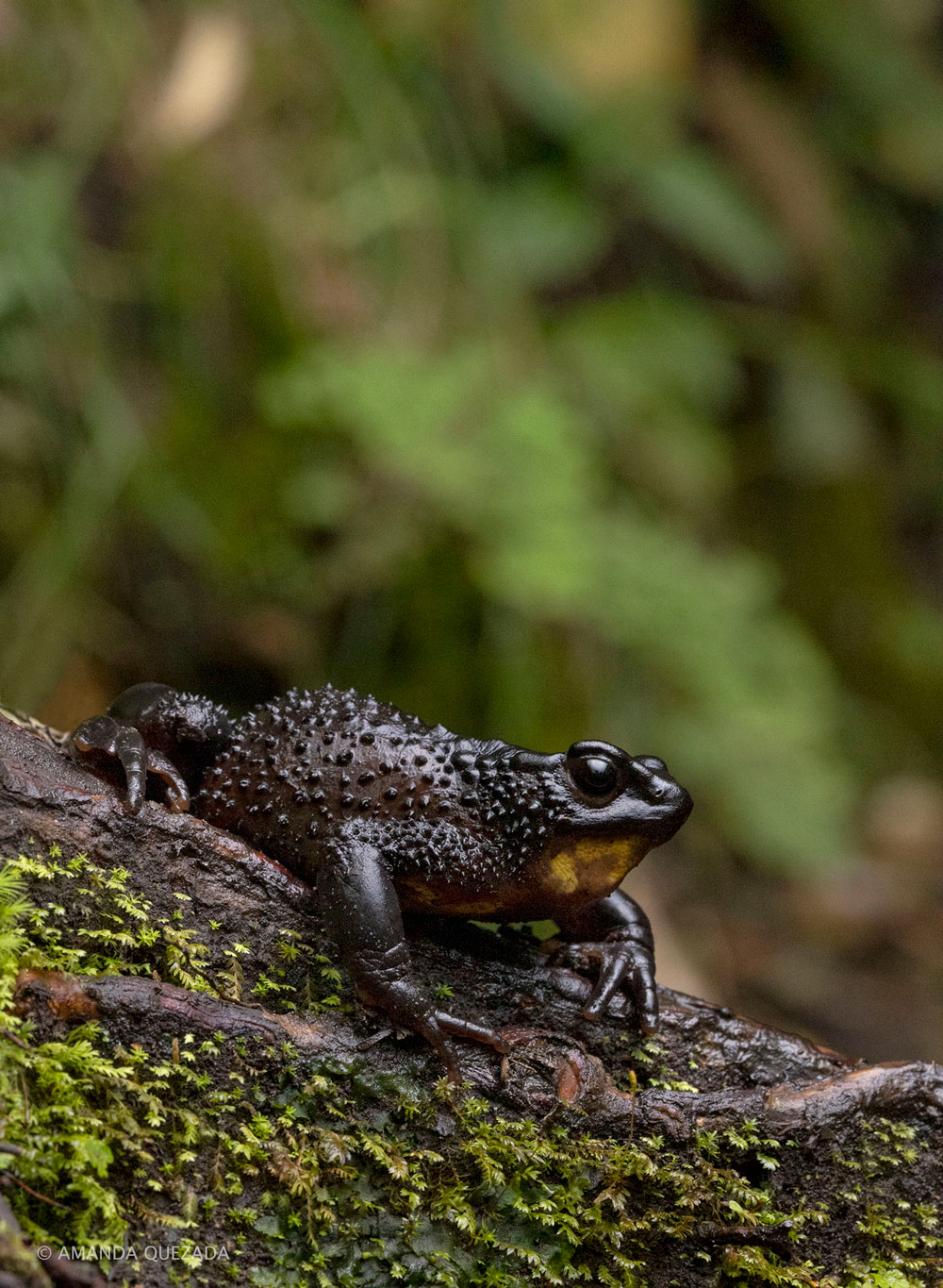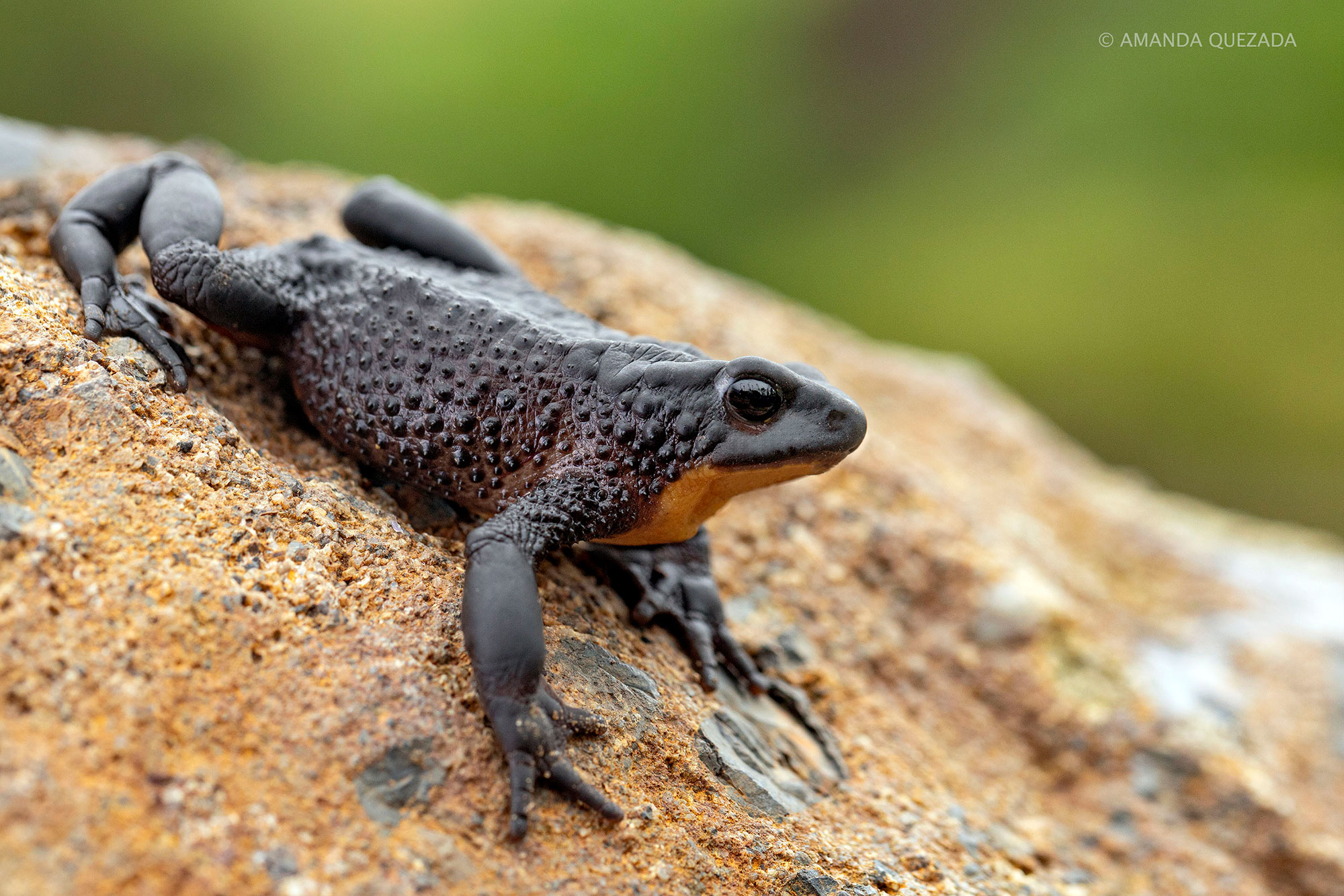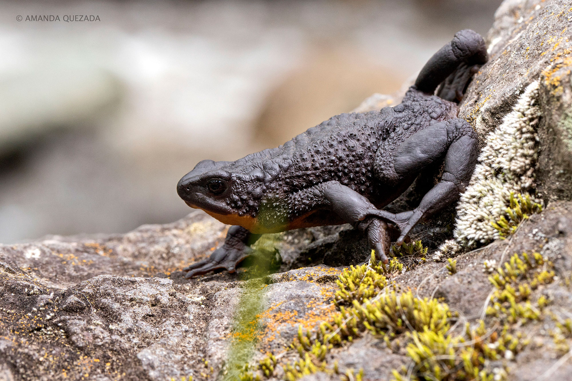 The Jambato’s scientific name (Atelopus ignescens), is a derived from the high contrast black-to-orange coloring found between their back and abdomen (belly), similar to a lighted piece of charcoal: ”ignescens” means “to become inflamed” in Latin. Their common name derives from the Kichwa word “jampatu”, which means frog. This name is derived as a result of it being so abundant, therefore this particular species generic image of any frog for its neighboring humans. It was frequently found in grasslands, pastures, and around the cities of Latacunga, Quito and Ambato. The latter city in fact owes its name to this frog which was once common in the area. This species is characterized by being diurnal, terrestrial, and slow-moving. Its reproduction takes place in flowing water in rivers where they engage in amplexus, which is when the male frog latches onto a female’s back. The female then deposits its eggs in rivers and streams. The tadpoles live under rocks, thanks to a suction cup that allows them to firmly attach themselves. In our monthly research trips we continue to further our knowledge of the basic biology of this frog, as we have a long way to go in our understanding.